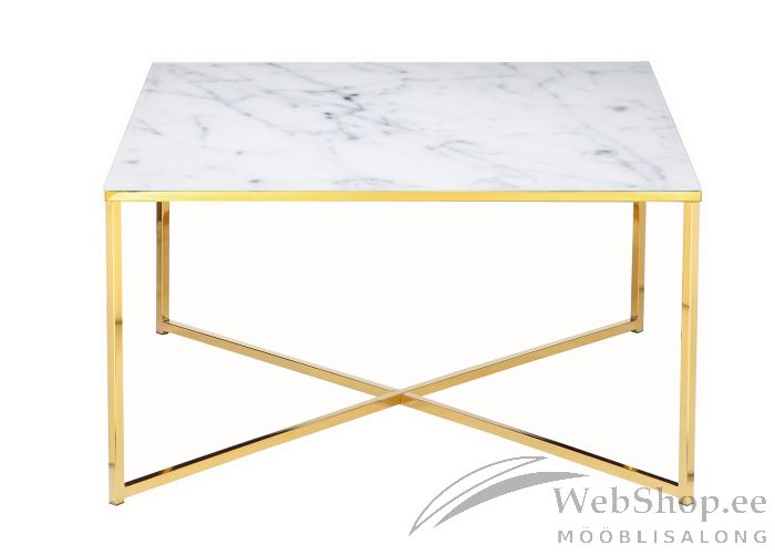 Metallist kulla tooni jalgadega diivanilaud. Lauaplaat on klaasist, klaasi all on marmorivälimusega kile.