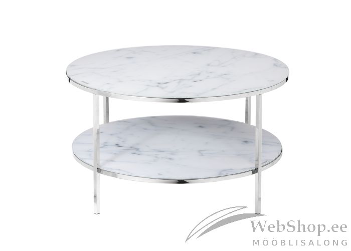 Kroomitud metallist jalgadega diivanilaud. Lauaplaat on klaasist, klaasi all on marmorivälimusega kile. Laud on kahe tasandiline.