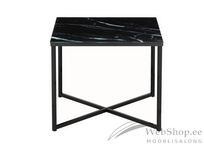 Musta värvi metallist jalgadega diivanilaud. Lauaplaat on klaasist, klaasi all on marmorivälimusega kile.