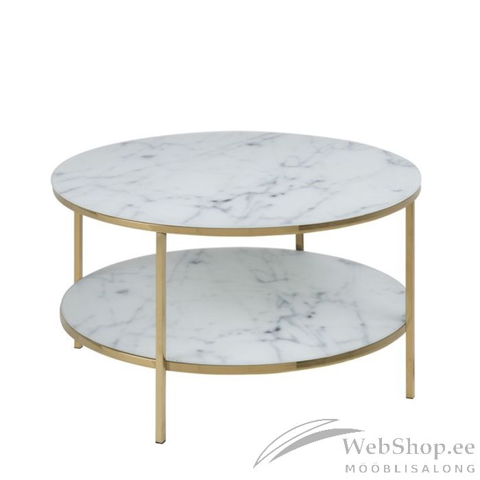 Diivanilaud ALISMA D80xH45cm, valge marmor/kuldne. Kohvilaual on külluslik välimus, mis on kõike muud kui igav. Kuldse kroomitud aluse ja mattvalge marmori välimusega mattklaasist lauaplaadi kombinatsioon toob ruumi põnevust. Karastatud klaas valge marmortrükiga. Lisaks üks valgest marmorist välimusega riiul. Kergesti hooldatavatest materjalidest valmistatud, klaasipuhastusvahendist ja mikrokiudlapist piisab toote hooldamiseks. Mõõdud: D80xH45cm.