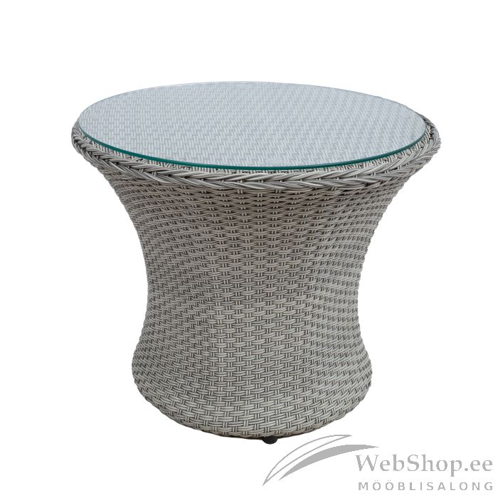 Diivanilaud ASCOT D56xH46cm, hall. Laua raam on valmistatud alumiiniumist ja kaetud plastikpunutisega. Lauaplaat: 5mm karastatud läbipaistev klaas. Toode on muutlikes ilmastikutingimustes vastupidav ja väga lihtsalt hooldatav. HOIUSTAMINE: suvehooaja lõppedes soovitame aiamööblit hoiustada siseruumides. Puhastage ja kuivatage mööbel enne hoiule panekut. Kasutage hoiustamiseks jahedat, kuiva ning hea ventilatsiooniga ruumi.