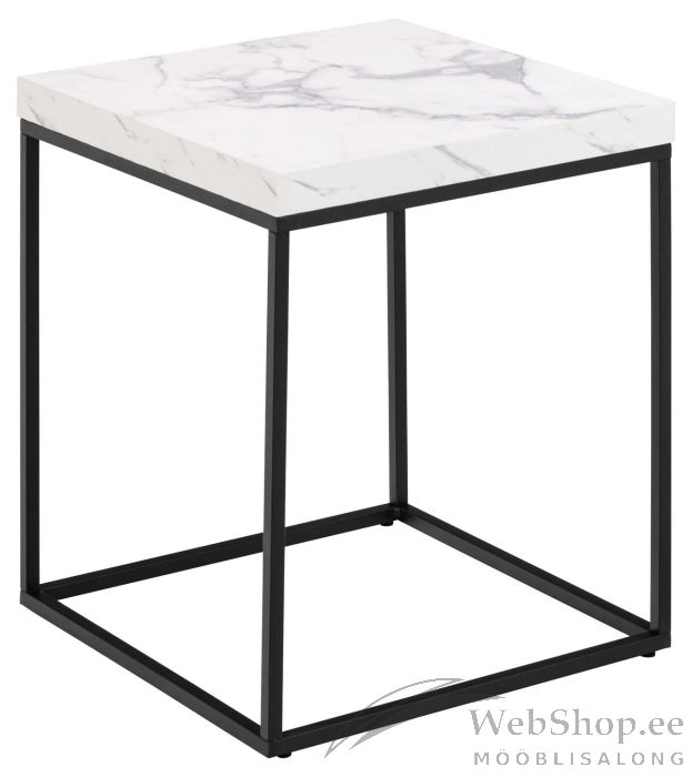 Diivanilaua ilmekas lauaplaat toetub ruudukujulisele terasalusele. Lauaplaadil on valge marmori välimus ja see on valmistatud puitkiudplaadist. Mõõdud on 40x40xH45cm. HOOLDUS: Kasutage seebiveest kuivaks väänatud lappi ja pühkige pind kuivaks. Vältige küürimispulbri või nailonkäsnade kasutamist, kuna need pleegitavad või kriimustavad pinda. Ärge hõõruge pinda kõvade esemetega.
