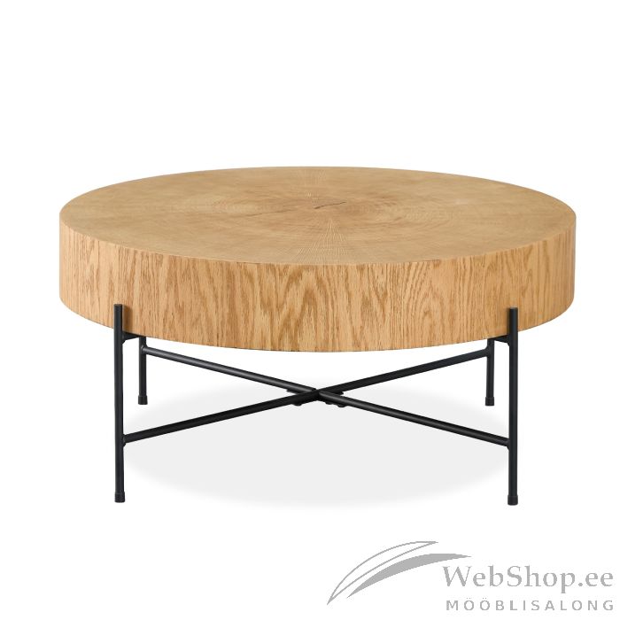 Diivanilaud CASTINO D75xH36cm, tamm. Efektne, puidupakku meenutav laud on tõeline meistriteos. Lauplaadil kajastub väärika tamme terve elukaar aastaringide, väikeste pragude ja säsikaartega. Stabiilsuse tagamiseks on lauaplaat valmistatud MDF plaadist, millele on liimitud kaunis 6mm spooni kiht. Puidupind on viimistletud õlivahaga. Laua must terasest jalg on emailviimistlusega. Toote valmistamiseks on kasutatud FSC sertifikaadiga puitmaterjali.