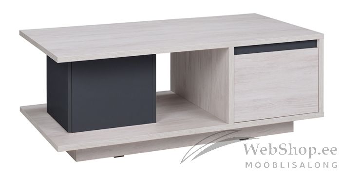 Tänapäevase moodsa disainiga kvaliteetsest lamineeritud plaadist valmistatud diivanilaud. Laual on avatud riiul ja kolm pisikest kappi. Võimalik tellida kolme eri värvi.