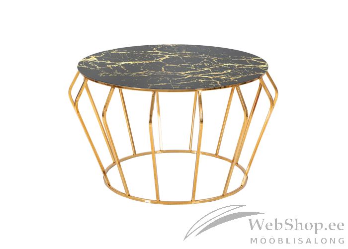 Stiilne kuldset tooni metallist diivanilaud. Laua pealmine plaat on valmistatud klaasist marmori imitatsiooniga.