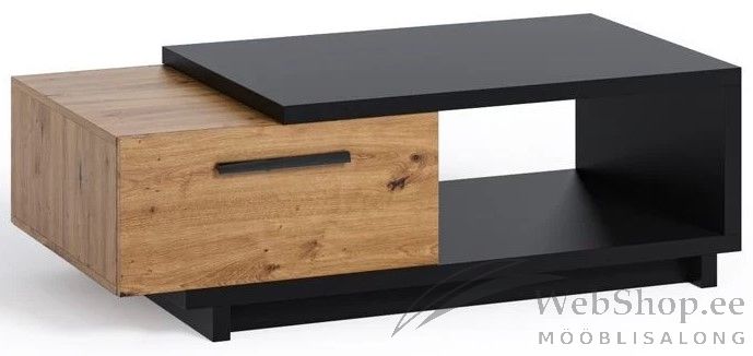 Kvaliteetsest lamineeritud plaadist valmistatud avatud riiuli ja sahtliga diivanilaud. Lauale annavad effekti musta värvi paksemast materjalist lauaplaat, põhi ja sokkel.