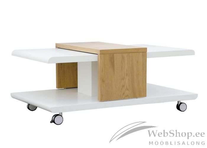 Valgest MDF-mööbliplaadist diivanilaud. Viimistlus: tamm. Laud on ratastel. Tamme viimistlusega plaat on samuti ratastel.