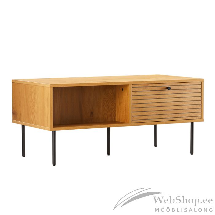 Diivanilaud LINE 2-sahtli ja 2-riiuliga 100x50xH45cm. Laud on valmistatud tammedekooriga melamiinplaadist. Efektsed reljeefse pinnaga triibulised sahtlite esipaneelid on valmistatud mustast MDF plaadist, mida kaunistavad tammevärvi kitsad liistud. Laua metallist jalad on viimistletud musta pulbervärviga.