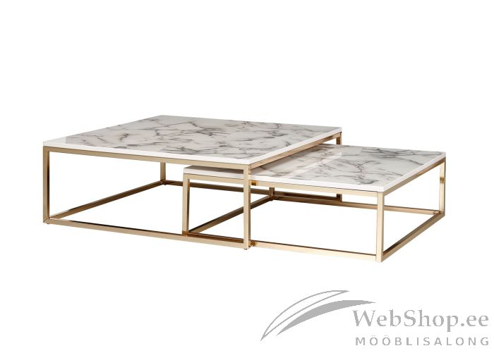 Stiilne diivanilaudade komplekt. Komplekti kuulub 2 lauda. Lauad sobivad elutuppa kuhu soovite lisada stiili ja elegantsi. Lauaplaat on MDF-mööbliplaadist mis on kaetud PVC-kattega. Raam on kulla tooni tugevast metallist. Jalgade all on plastikust korgid mis kaitsevad sinu põrandat kriimustuste eest.