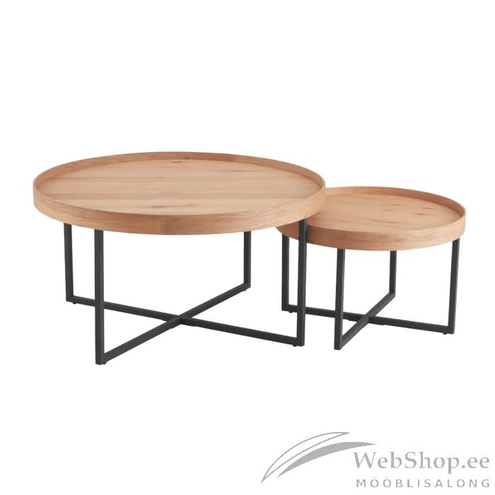 Diivanilaud MUSIC 2tk komplektis D60xH38, D90xH46, tamm. Lauaplaat ja äär on valmistatud tammevineerist. Laua must terasest jalg on emailviimistlusega.