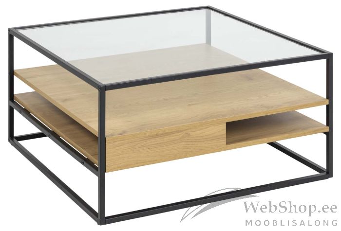 Kuubikujulise metallraamiga diivanilaud sobib suurepäraselt igasse kaasaegsesse koju. Läbipaistev klaas annab sellele kerge ilme. Kaks metsiku tamme välimusega riiulit on stiilseks panipaigaks. Mõõdud on 80x80xH40cm. HOOLDUS: Hoidke klaaspind puhas, et vältida kriimustusi. Pihustage klaasipuhastusvahendit ja pühkige mikrokiudlapi või paberrätikuga. Pinnakahjustuste vältimiseks kasutage lauamatte ja klaasialuseid. Alus: Kasutage igapäevaseks puhastamiseks seebiveest kuivaks väänatud lappi. Rooste vältimiseks pühkige pind kuivaks. Ärge hõõruge pinda kõvade esemetega.