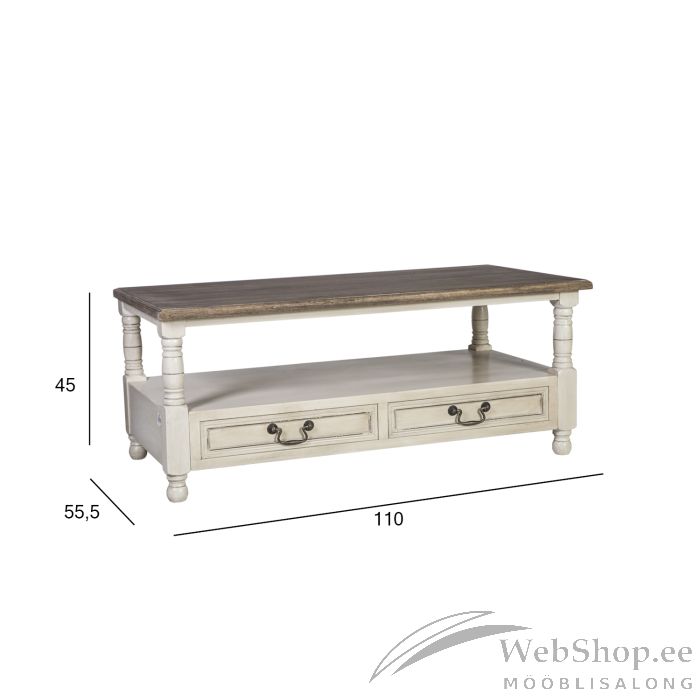 Lauaplaat: antiikpruun, raam/sahtlid: antiikvalge. 2 sahtlit metallist käepidemetega. Puit: saar/paulownia/MDF, viimistlus: värvitud.