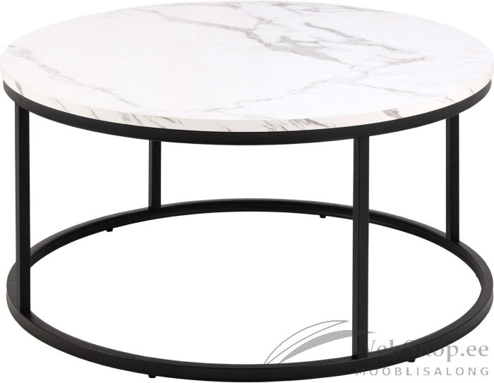 Omanäolise ümara lauaplaadi ja ümara alusega diivanilaud. Valge marmori välimus annab lauale kaasaegse ilme. Lauaplaat on valmistatud melamiinist. Koos musta pulbervärvitud metallalusega sobib laud enamikesse kodudesse. Mõõdud D80xH40cm.