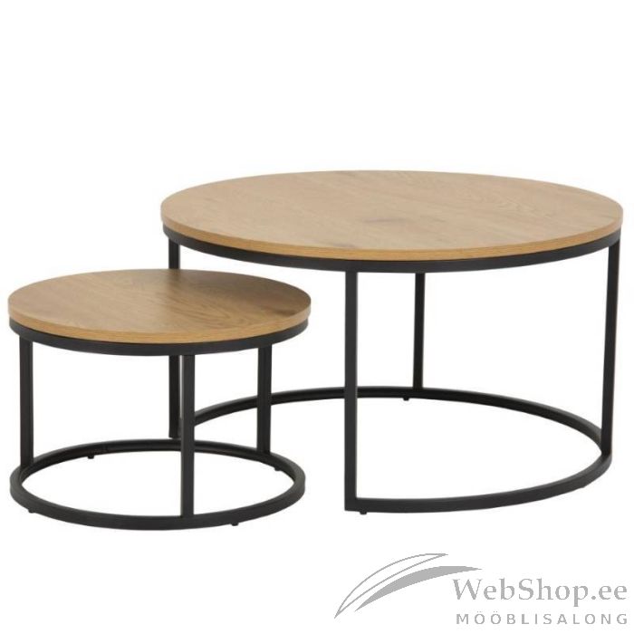 Ümara siluetiga kahest lauast koosnev komplekt on igas kaasaegses kodus praktiline. Kompaktne disain on hea ka väiksematesse ruumidesse, väiksem laud mahub täielikult suurema alla. Must metallraam sulandub täiuslikuks tervikuks koos sooja tammepuiduga.