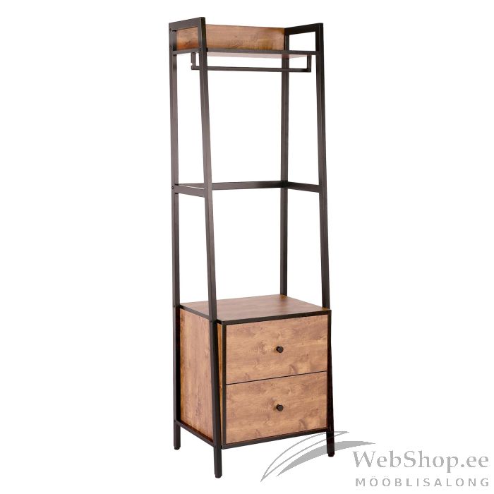Esikuriiul LAVINIA 2-sahtli ja stangega 52x40xH169cm, saar/must. Riiuli raam on valmistatud metallist ja viimistletud musta pulbervärviga. Riiulid sahtlipaneelid on valmistatud saaredekooriga melamiinplaadist.