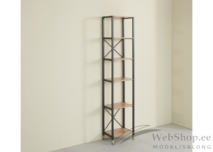 Industriaalstiilis riiul. Riiuli raam on valmistatud musta värvi metallist. Riiulid MDF-mööbliplaadist, kaetud akaatsia dekooriga. 5 vaheriiulit. Vaheriiulid on eemaldatavad. Riiul sobib kõrguti sama sarja toodetega.