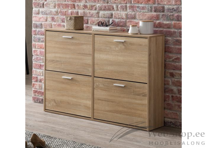 Kaasaegses stiilis jalanõude kapp. Toode on sonoma tamme värvi melamiinkattega mööbliplaadist. 4 alla liikuvat ust, mille taga on riiulid jalanõude paigutamiseks.