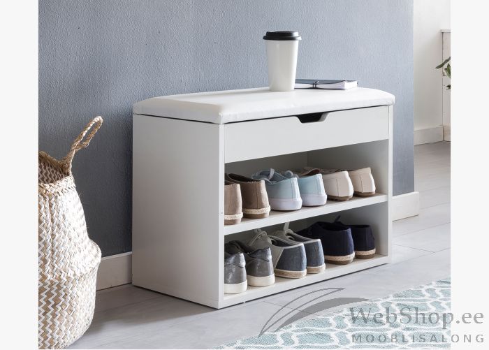 Kaasaegses stiilis istmega jalanõude riiul. Toode on valget värvi melamiinkattega mööbliplaadist. Valget värvi kunstnahast pehmendus istumiseks. Istumisaluse all on panipaik, kuhu on võimalik paigutada näiteks kindad ja mütsid. Maksimaalne kandevõime 80kg.