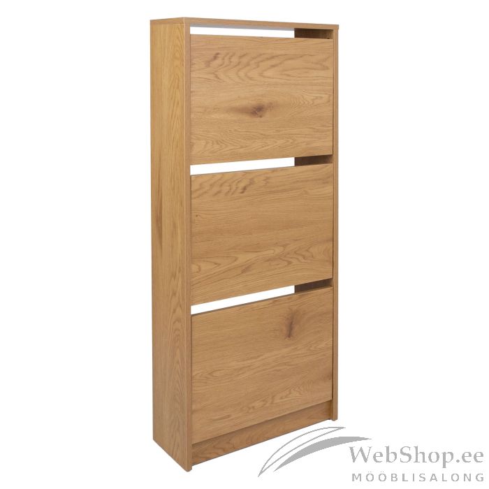 Jalatsikapp AALBORG 49x18xH122cm, melamiin tammedekooriga. Kapil on kolm sahtlit jalanõude paigutamiseks. Kapp on valmistatud melamiinplaadist.