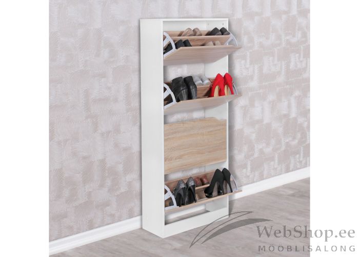 Valget ja sonoma tamme värvi mööbliplaadist jalatsikapp. Kapil on 4 alla avanevat ust. Iga ukse taga on üks vaheriiul jalatsite paigutamiseks.