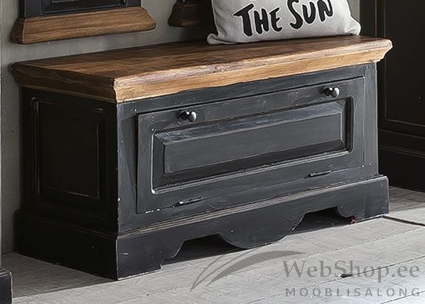 Mangopuidust ja MDF-mööbliplaadist jalatsikapp. Küljed valmistatud MDF-mööbliplaadist. Kapi pealmine plaat ja ukse paneel mangopuidust. Pealmine paneel mee tooni. Viimistlus: must. 1 uks, mille taga 1 riiul. Taotuslikult tehtud kulumisjäljed. Tarnitakse monteeritult.