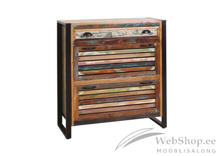 Taaskasutatud puidust valmistatud jalatsikapp. Viimistlus: mitmevärviline. 2 ust, 1 sahtel. Ukse taga üks riiul. Mõlema ukse taga üks riiul. Sahtel liigub avas siinideta.