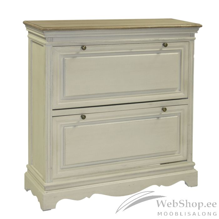 Jalatsikapp SAMIRA 92,5x32xH97cm, antiikvalge/naturaalne. Kapi põhikonstruktsioon ja sokkel on valmistatud saarepuidust, MDF küljepaneelid. Kapp on viimistletud antiikvalge värviga. Pealmine MDF plaat on kaetud naturaalse paulownia spooniga. Kapil on kaks ette kallutatavat sahtlit jalatsite paigutamiseks. Sahtlitel on metallist käepidemed.