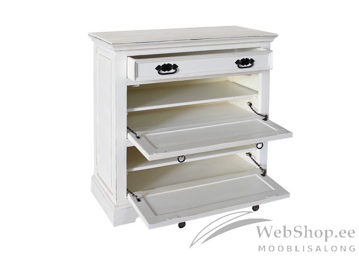 Mangopuidust ja MDF-mööbliplaadist valmistatud jalatsikapp. Viimistlus: antiikvalge. 2 ust, kummagi taga 1 riiul. 1 sahtel, mis liigub avas siinideta. Taotuslikult tehtud kulumisjäljed.