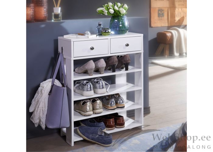 Modernses stiilis jalatsiriiul. Riiul on valmistatud melamiinkattega mööbliplaadist. Viimistlus: valge. 4 riiulit jalanõude paigutamiseks ja 2 sahtlit. Sahtlid liiguvad avas metallist siinidel.