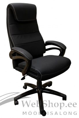 Külgedel olevate valgete õmblustega mustast kangast ratastega kontoritool.
