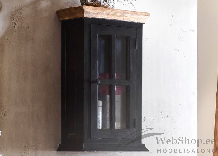Mangopuidust ja MDF-mööbliplaadist kapp. Küljed on valmistatud MDF-mööbliplaadist. Kapi pealmine plaat mangopuidust mee tooni. Viimistlus: must. Üks klaasist uks. Ukse taga üks riiul. Tarnitakse monteeritult. Taotuslikult tehtud kulumisjäljed.