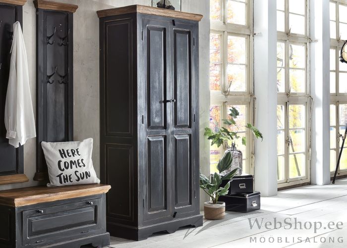 Mangopuidust ja MDF-mööbliplaadist riietekapp. Ülemine äär ja uste paneelid mangopuidust. Küljed MDF-mööbliplaadist. Kapi ülemine äär mangopuidust, mee tooni. Viimistlus must. 2 ust, mille taga 3 riiulit. Taotuslikult tehtud kulumisjäljed. Tarnitakse monteeritult.