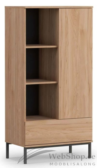 Kvaliteetsest lamineeritud plaadist valmistatud metallist raamil käepidemeteta kapp-riiul. Vasakul kolm avatud riiulit, paremal uksega kapiosa ja all lai sahtel. Võimalik tellida kolm eri värvi.