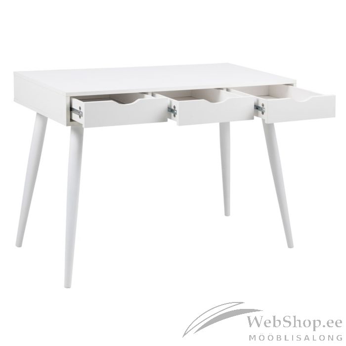 Kirjutuslaud NEPTUN 110x50xH77cm, valge. Kirjutuslaud on vajalik täiendus igas kodus, võimaldades mugavamalt arvutit kasutada või endale praktiline kodukontori ruum luua. Kirjutuslaual on kolm sahtlit, mis on metallsiinidel. Laud on valmistatud melamiinplaadist. Värvus on valge. Jalad on valmistatud musta värvi metallist. Toote mõõdud on 110x50xH77cm.