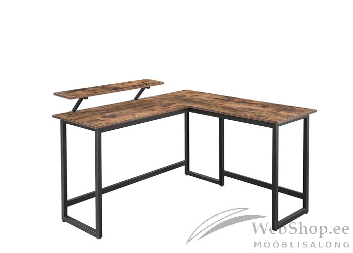 Rustikaalses stiilis nurgalaud on valmistatud mööbliplaadist, metallist raam ja jalad. Eraldiseisev riiul monitori, printeri või raamatute jaoks. Riiuli asukohta on lihtne muuta vastavalt vajadusele. Laua maksimaalne kandevõime on 50 kg. Värvus: pruun/must.
