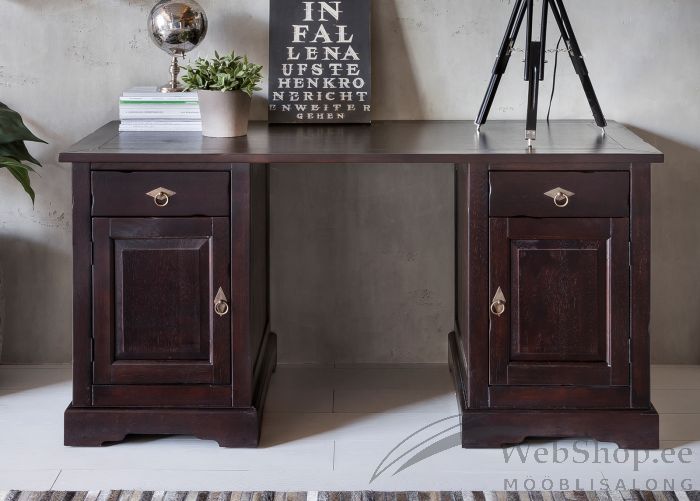 Akaatsiapuidus valmistatud kirjutuslaud. Viimistlus: antiik. 2 ust, 2 sahtlit. Sahtlid liiguvad avas siinideta. Uste taga 1 riiul.