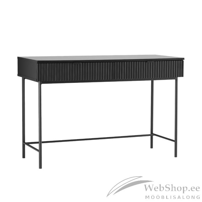 Kirjutuslaud SEQUENCE 120x50xH79cm, must. Lauaplaat ja korpus on valmistatud mööbliplaadist. Sahtlite esiküljed: dekoratiivne MDF ribiplaat. Laud on viimistletud vastupidava polüuretaanvärviga. Laua jalad ja alusraam on valmistatud metallist ja kaetud pulbervärviga.