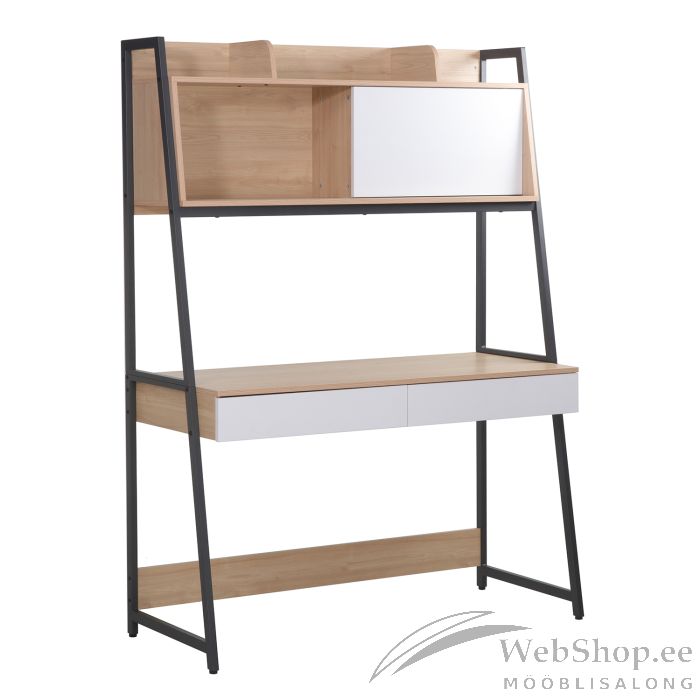 Kirjutuslaud STUDY riiuliga 124x54xH171cm, tamm/valge. Kirjutuslaual on 2 sahtlit ja üleval lükanduksega riiul. Lauaplaat, riiulid ja sahtlite esipaneelid on valmistatud melamiinplaadist. Raam on valmistatud metallist ja viimistletud pruuni pulbervärviga.
