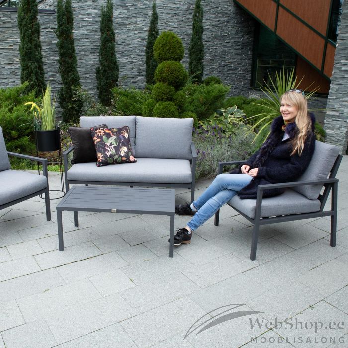 Diivani ja toolide raamid, lauplaat ja -jalad on valmistatud alumiiniumist ning kaetud tumehalli pulbervärviga. Laud 90x48,5xH38,5cm. Tugitool 68x79,5xH78cm. Tugitooli istmepadi 62x62x8cm, seljatoepadi 62x45x8cm. Diivan 128x79,5xH78cm. Diivani istmepadi 121x62x8cm, seljatoepadi 2tk - 62x45x8cm. Padjakatted: hall polüesterkangas.