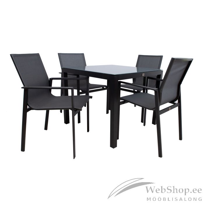 Laud 90x90x74cm. Lauaplaat: 5mm karastatud klaas. Alumiiniumist raam ja jalad viimistletud halli pulbervärviga. Tool 58x65xH90cm, hall textiline iste. Tooli raam on valmistatud alumiiniumist ja viimistletud halli pulbervärviga. Kaalupiirang 120kg.