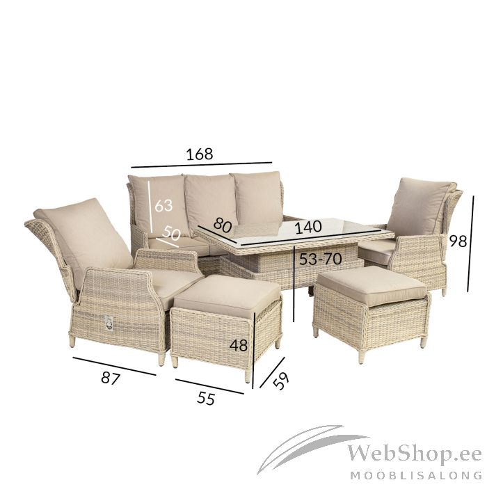 Reguleeritava kõrgusega laud 140x80xH48-68, lauaplaat: 5mm läbipaistev klaas. 3-kohaline diivan 168x86xH98cm. Reguleeritava seljatoega tugitool 64x86xH98cm. Tumba 55x60xH45cm. Padjad kuuluvad komplekti. Patjade kattematerjal: olefin kangas, värvus: beež. Plastikpunutise värvikood: BM9648-8mm.