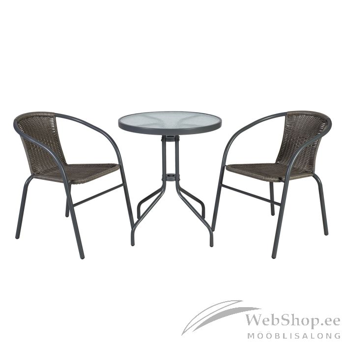 Laud D60xH70cm, lauaplaat: läbipaistev karastatud laineklaas.Tool H73cm, iste ja seljatugi: plastikpunutis, terasraam: värvus: hall. Toode on ilmastikukindel.