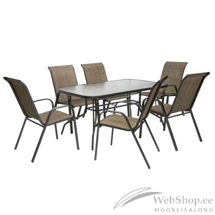 Laud 150x90xH70cm, tumepruun pulbervärvitud terasraam. Lauaplaat: 5mm läbipaistev laineline klaas. Tool 73x55,5xH93cm, tumepruun pulbervärvitud terasraam. Kuldpruun textilene iste. Istme laius 46cm, istme sügavus 43cm, istme kõrgus 43,5cm. Toolid on virnastatavad. Toode on ilmastikukindel. Kaalupiirang 100kg.