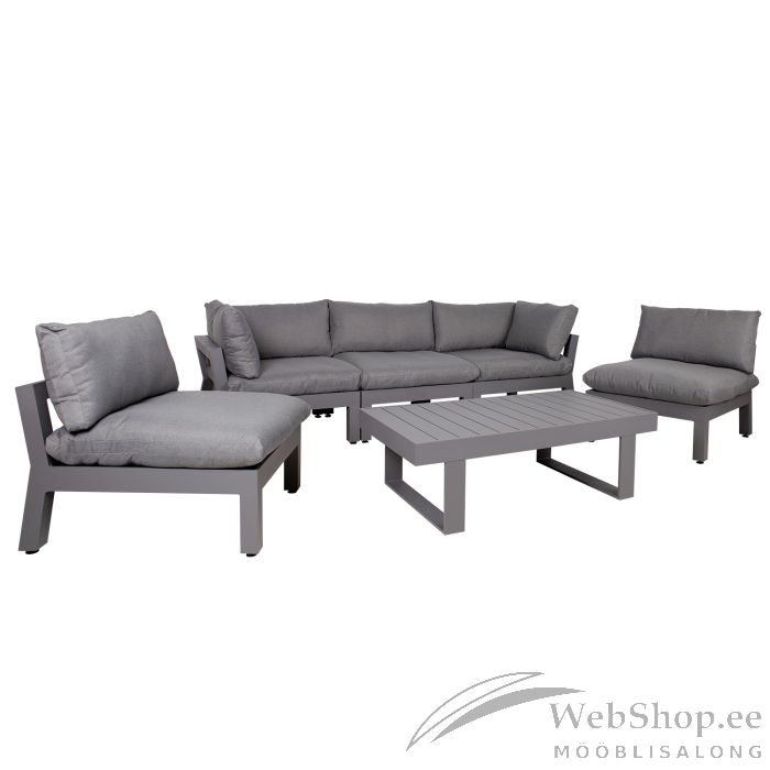 Diivanilaud 133x73,5xH42cm, lauaplaat ja raam: tumehall alumiinium. Komplekti kuulub 2 nurgamoodulit (13792) 93x93xH66cm ja 3 ilma käetugedeta moodulit (13793) 82x93xH66cm. Diivanimoodulid on valmistatud alumiiniumist ning kaetud tumehalli pulbervärviga. Padjad kuuluvad komplekti. Padjakatted: tumehall polüesterkangas. Moodlitest on võimalik moodustada erineva kuju ja suurusega diivaneid või kasutada üksikute istmetena.
