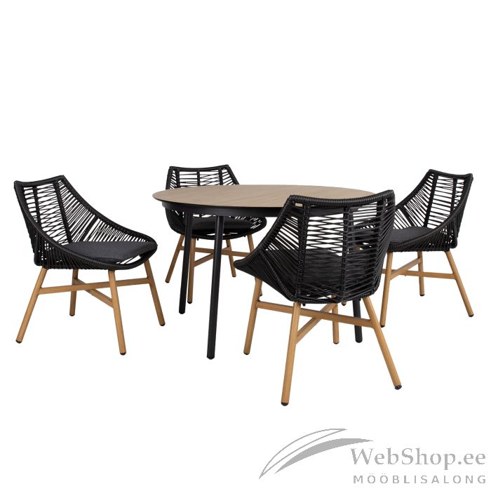 Laud D120xH74cm, lauaplaat: tiikpuu dekooriga ilmastikukindel laminaat. Jalad ja raam on valmistaud alumiiniumist ning kaetud musta pulbervärviga. Tool 64x65xH84cm. Tooli istmeosa on kaetud musta plastiknöörpunutisega, alumiiniumist jalad ja alusraam on värvitud tiikpuu sarnaseks. Istmepadi kuulub komplekti. Padjakate: tumehall polüesterkangas.