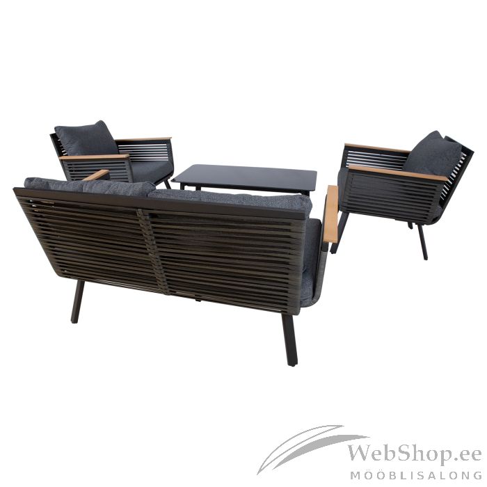 Diivan 129x73xH73cm. Tugitool 71x73xH73cm. Diivani ja toolide raamid ja jalad on valmistatud alumiiniumist ning värvitud musta pulbervärviga. Istmeosa on kaetud musta plastikpunutisega. Käetugedel tiikpuu värvi liistud. Padjad kuuluvad komplekti. Padjakatted: tumehall polüesterkangas. Laud 100x50xH42cm, lauaplaat: must klaas, alumiiniumist jalad ja raam on värvitud musta pulbervärviga.