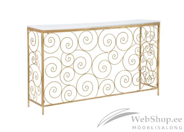 Stiilne konsoollaud. Kulla tooni metallist raam. Valget värvi marmorist lauaplaat.
