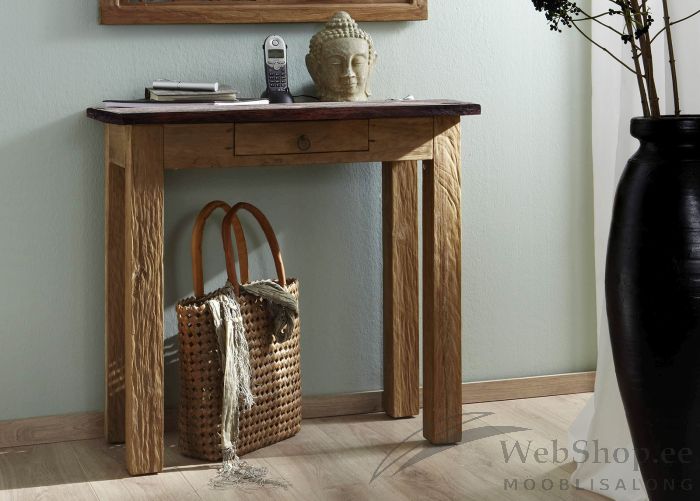 Taaskasutatud tiikpuust laud. Viimistlus: naturaalne/koloniaal. Laual on 1 sahtel. Sahtel liigub avas siinideta. Iga toode on originaalne ja võib erineda pildil olevast, sest on naturaalsest puidust.