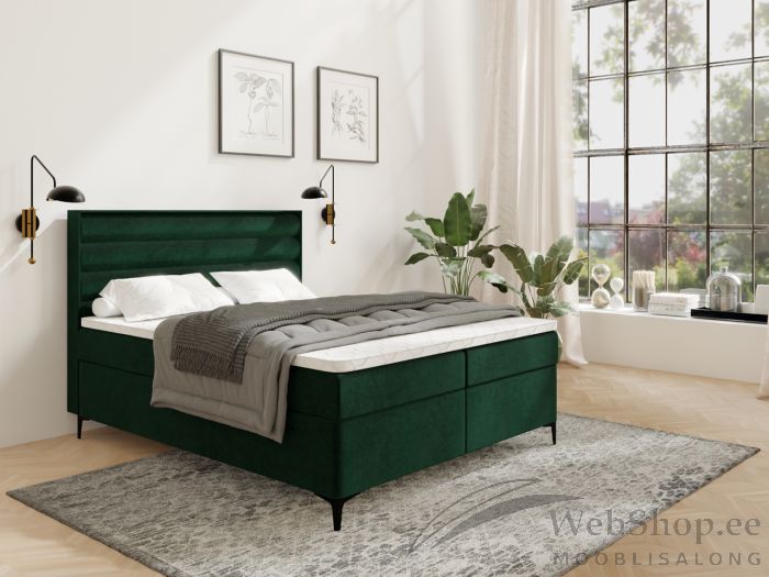 Kõrge ja pehme peatsi ning kahe mahuka täispuidust pesukastiga 140 cm laiune kontinentaalvoodi laia kangaste värvivalikuga.