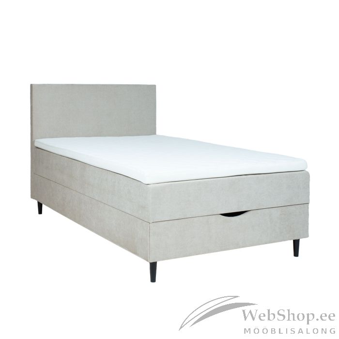 Voodi kattemadrats on poroloonist ja selle paksus on 7cm. Kattemadratsi all asub pocket-vedrustusega madrats. 210vedru/m2, vedru kõrgus 13cm. Madratsi jäikus: keskmine. Voodi raam on valmistatud puidust, puitlaast- ja puitkiudplaadist. Voodi all asub ruumikas panipaik. Voodijalad on valmistatud puidust, 14cm kõrged. Voodipeats on voodiga sama lai, selle paksus on 7cm, kõrgus 105cm. Ühenduselemendid on lisatud. Voodi on kaetud kangaga, 30 000 Martindale´i. Voodi kõrgus maast on 70cm. Toote mõõdud on 121x208xH119cm. Toode on valmistatud EL-is.
